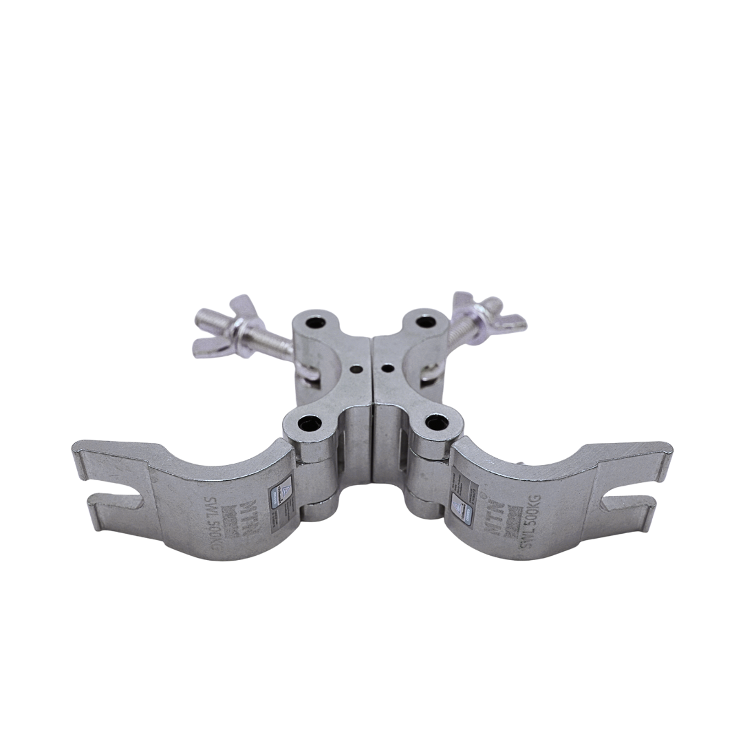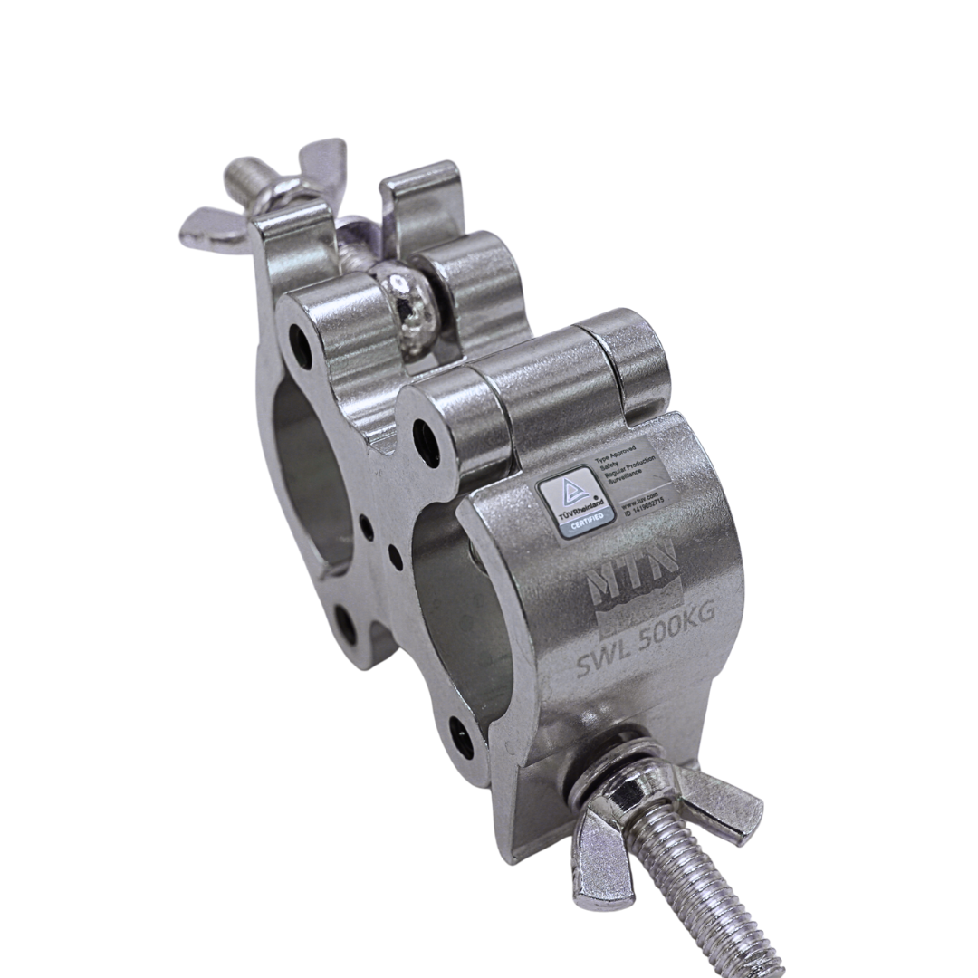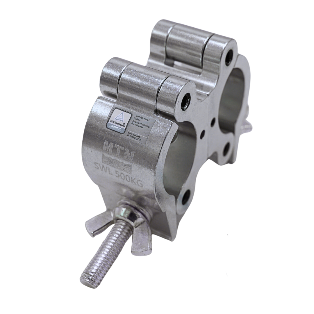 The MTN Swivel Coupler features a top wing nut that can be replaced with a die-casting knob. This coupler can be fixed at either 90° or 180° using the additional pins included in the package. TUV certified, it is available in silver polished or black anodized finishes offering durability and versatility.