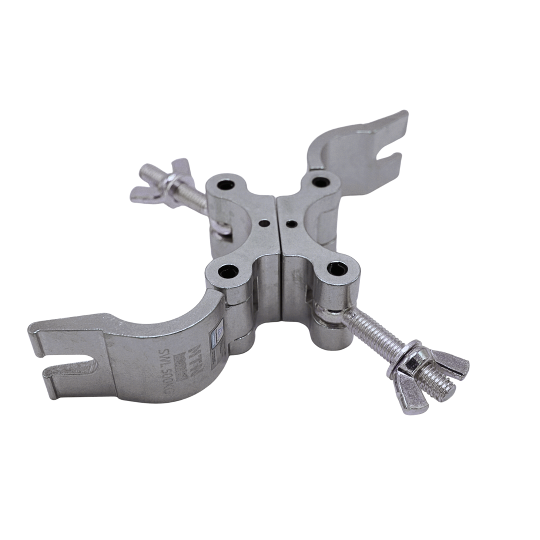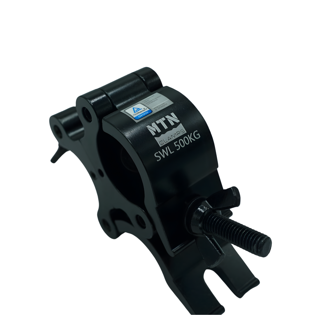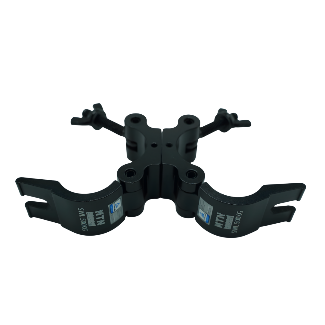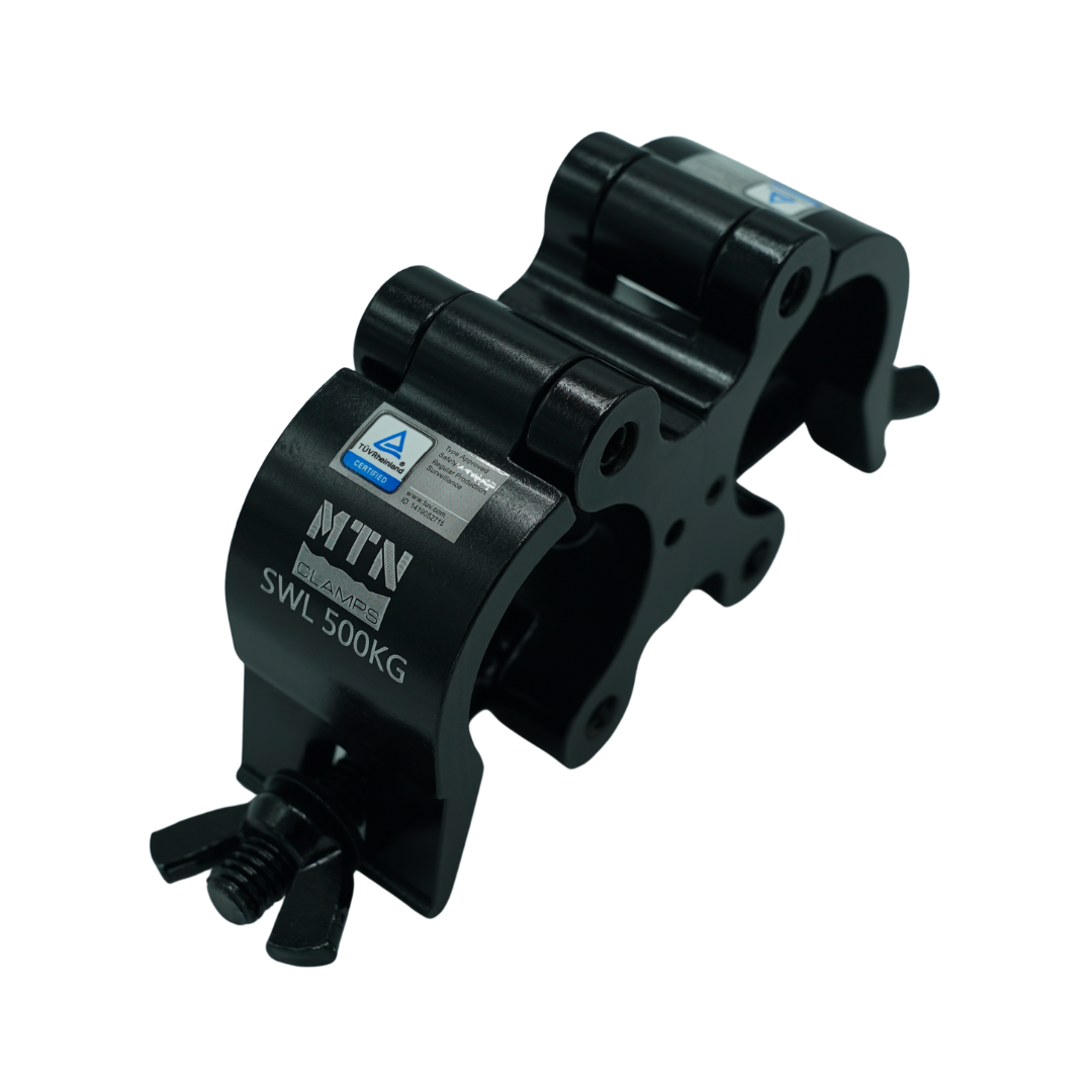 The MTN Swivel Coupler features a top wing nut that can be replaced with a die-casting knob. This coupler can be fixed at either 90° or 180° using the additional pins included in the package. TUV certified, it is available in silver polished or black anodized finishes offering durability and versatility.